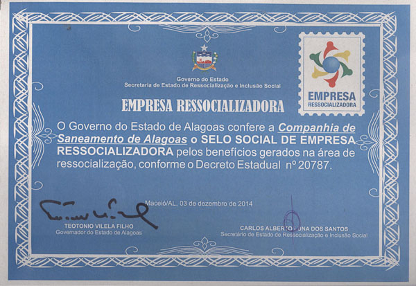 A Companhia de Saneamento de Alagoas (Casal) recebeu, pela segunda vez, o Selo Social de Empresa Ressocializadora, entregue pelo Governo do Estado no dia 3 de dezembro. Atualmente, a empresa absorve mão-de-obra de 77 reeducandos.