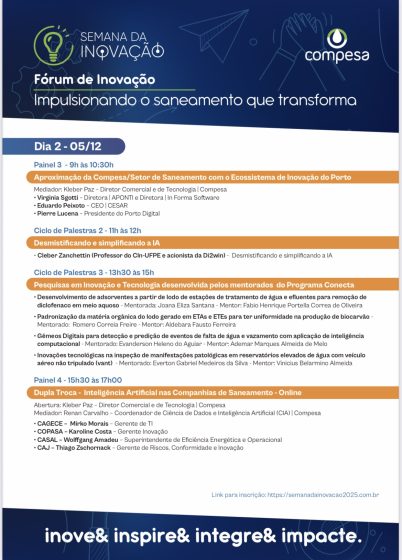 Aos funcionários da Casal que desejam parricipar do evento de forma on-line, a inscrição pode ser feita no link: https://semanadainovacao2025.com.br/.
