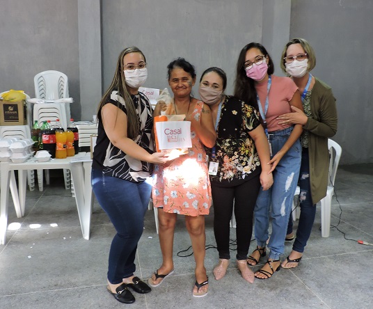 Casal doa cestas de higiene a moradoras da Casa de Passagem São Vicente de Paulo